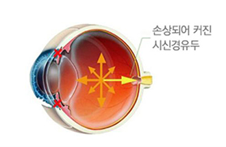 이때 특히 가장 약한 부분인 혈관이 지나가는 통로 (시신경유두)가 뒤로 밀리면서